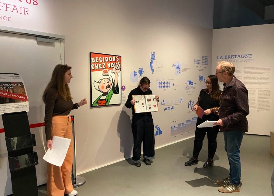 Sa proposition débute par une courte visite de l’exposition permanente, centrée sur plusieurs objets phares de l’histoire régionale. Parmi ces pièces figurent notamment un Guide de l’agriculteur du XIXᵉ siècle, une page du journal satirique L’Assiette au beurre, une coiffe bigoudène, ainsi qu’une sélection d’affiches témoignant des représentations culturelles locales.