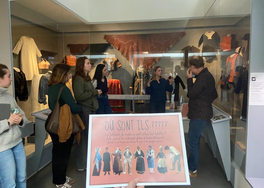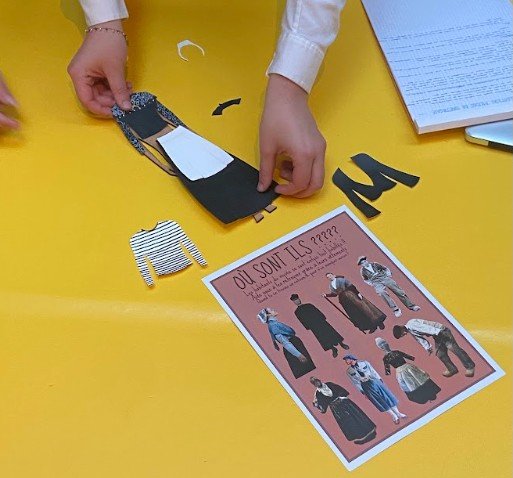 À l’issue de la visite, les enfants participent à un atelier en salle de médiation qui prolonge et met en pratique les connaissances acquises durant le parcours. L’activité consiste à habiller une silhouette en suivant les indications du médiateur ou de la médiatrice, qui invite les participant·es à se mettre dans la peau d’un personnage : « Comment t’habillerais-tu si tu étais… (une sardinière, un paysan, etc.) ? »  Ce jeu d’identification permet au jeune public de mettre à l’épreuve sa mémoire et son sens de l’observation afin de reconstituer des costumes spécifiques à la région. Afin de rendre l’exercice plus stimulant, certains éléments perturbateurs, comme des vêtements contemporains, sont volontairement intégrés parmi les choix proposés, incitant les participants à affiner leur regard et à justifier leur choix.