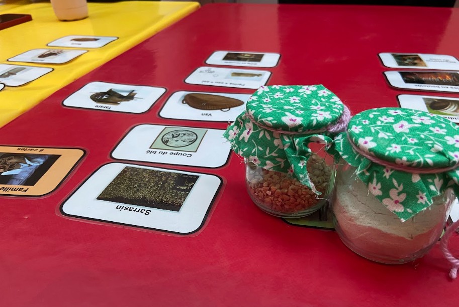 La médiation débute par une introduction dans l’espace général du musée où les enfants sont invités à découvrir les thématiques principales de la visite. Celle-ci se concentre sur la première partie du parcours permanent consacrée à la ruralité au XIXe siècle. Immédiatement, le groupe fait appel à la curiosité du jeune public par des questions et des manipulations sensorielles : les enfants sont encouragés à toucher la farine et le blé contenus dans un bocal. Ce prélude à la visite a pour avantage d’amorcer la réflexion sur l’origine des produits du quotidien.